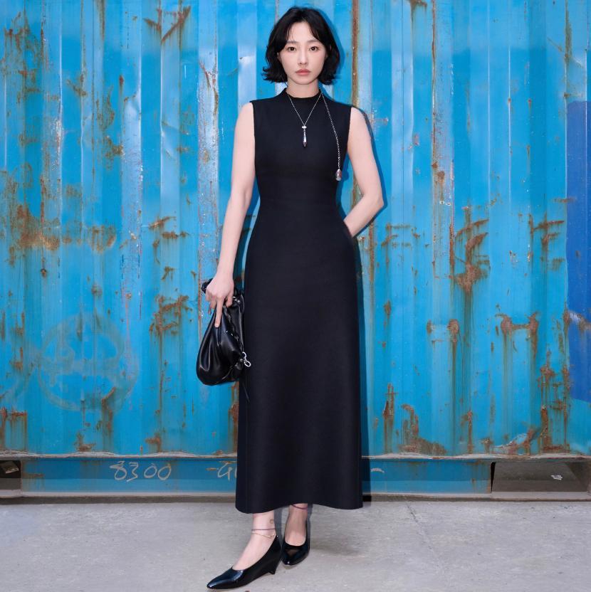 她选的是一条黑色无袖修身长裙,设计极其简约。