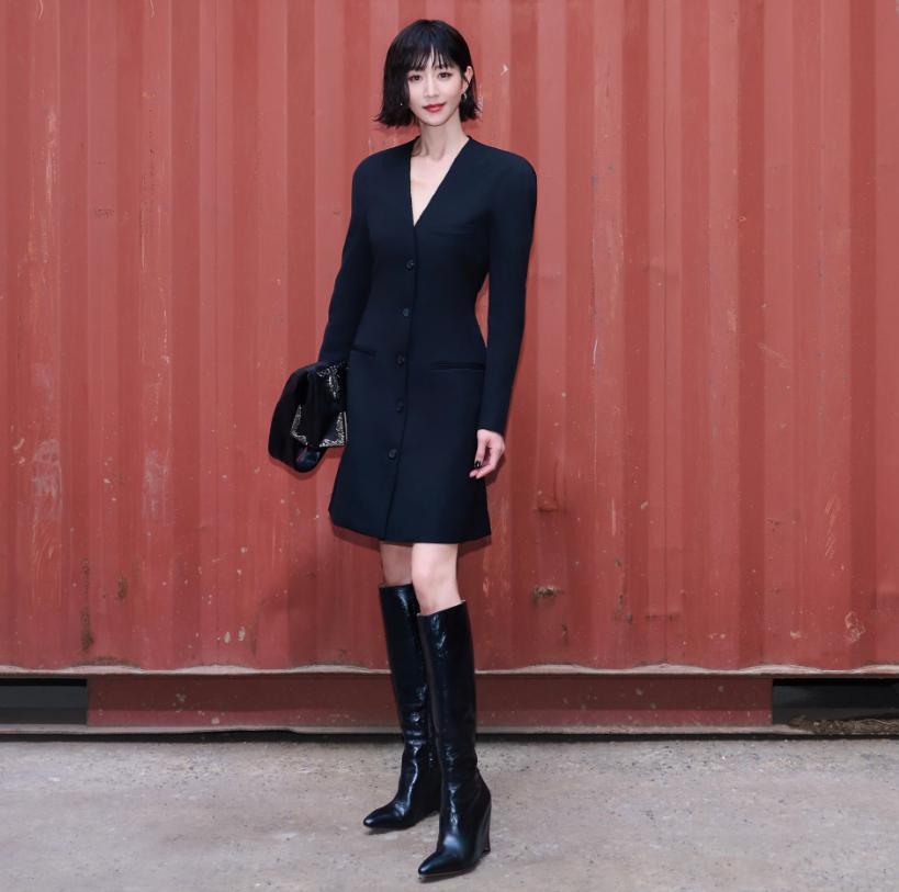 她当晚穿了一条看似平平无奇的西装款黑色连衣裙。