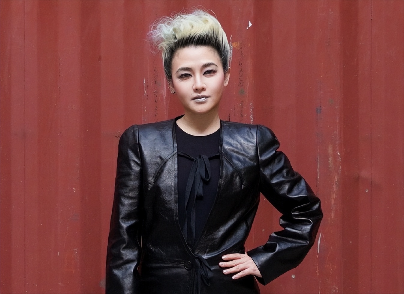 站在红色集装箱前,显得整个人松弛又不失好气质。